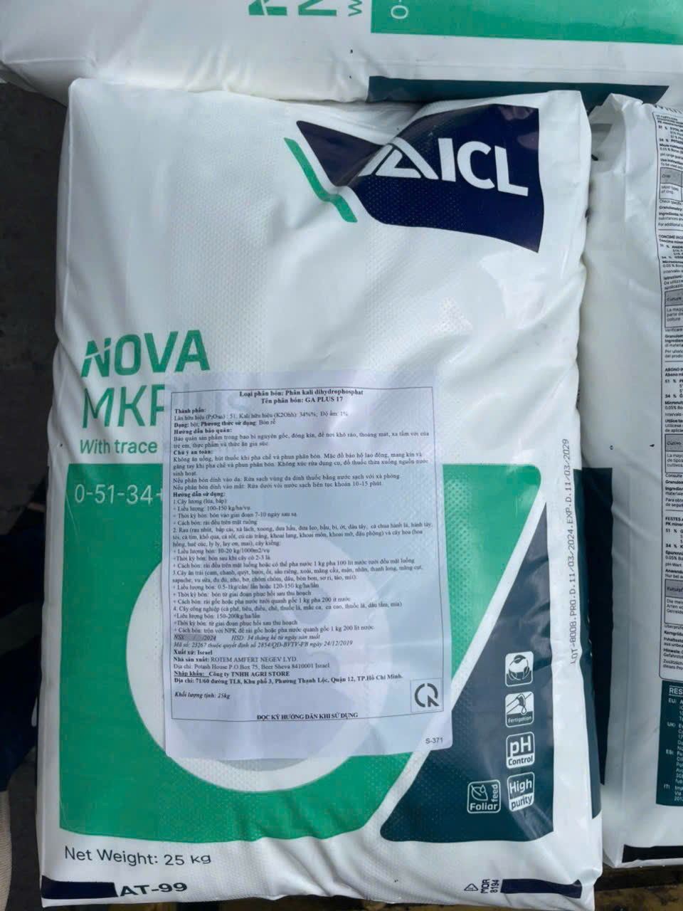 + Dùng trong thủy canh. CÔNG DỤNG: – NOVA ICL MKP 0-51-34 plus chứa Lân và Kali siêu cao dưới dạng dễ hấp thu, giúp cây sinh trưởng khỏe; cứng cây, chống đổ ngã; ra hoa tập trung, đậu trái đồng đều. – Giúp cây con ra rễ mạnh, chống nghẹn rễ; cây trồng hấp thu các chất dinh dưỡng thuận lợi tăng khả năng hút nước và dinh dưỡng; giúp cây phục hồi nhanh sau khi trồng hoặc bị ngập úng,hạn hán, ngộ độc hữu cơ. – Kích thích cây phát triển đọt non; thúc đẩy phân hóa mần hoa, ra hoa nhiều tập trung, tỷ lệ đậu trái cao, kích thước trái to, tăng độ đường ( ngọt); hạn chế rụng hoa và quả non; lúa trỗbông đồng loạt, chống nghẹn đòng. – Thúc đẩy lá non nhanh chóng trưởng thành (già), thuận lợi cho quá trình xử lý ra hoa trái vụ. – Giúp vận chuyển nhanh các chất dinh dưỡng về quả, củ và hạt; tăng độ ngọt cho cây ăn trái; tăng hàm lượng tinh bột cho cây lấy củ, lúa; kéo dài thời gian bảo quản. – Tăng tính chống chịu (chịu rét, hạn, phèn…); kích kháng với sâu bệnh hại. – Do không chứa đạm, nên vào mùa mưa MKP thường được dùng để thay thế phân nitrate kali (KNO) nhằm cung cấp chất kali làm tăng năng suất cây trồng đồng thời hạn chế được một số bệnh hại như đạo ôn, khô vằn, thán thư,…